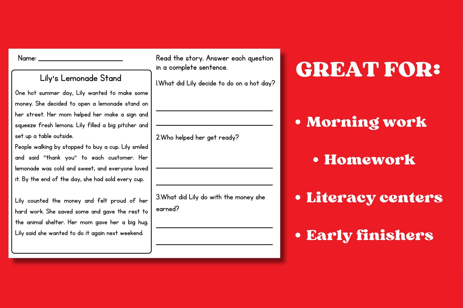 Reading Comprehension Worksheets, Stories with Questions, Reading Activities, Reading Passages, Second Grade, 2nd Grade ELA Worksheets, 30 Worksheets, PDF & PNG Format, 11"x8.5" Size